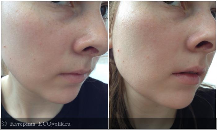 Маска разглаживает рельеф кожи, сужает поры, уменьшает воспаления. В реальности эффект конечно виден гораздо больше, но я надеюсь, что мои фото хоть как-то передают его.