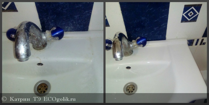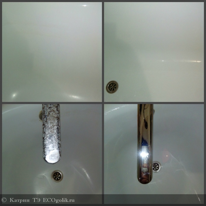 Итак, пришла я с новой покупочкой домой, и отправилась мыть ванну)) Она у меня не очень плачевном состоянии, дабы мою её перед каждым купанием малыша. Пару пшиков данного средства и моя ванна, как и краны засияла чистотой, а самое главное, после смывания продукта водой, в ванной комнате не осталось совершенно никакого запаха, что было для меня так важно=)