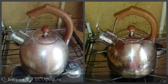 Далее в мои взор попал чайник, которым давно пора было заняться, а так же от моего взора не ушла глубокая посудина на которой красовался известковый налет. Но как мы уже знаем,удалить налет нашему средству труда не составит, и вот пару нажатии на дозатор, ещё пару минут, протираем губкой и вуаля!))