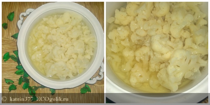 2. Отвариваем капусту 10 минут на пару или в небольшом количестве воды. Польза цветной капусты высока, но при варке много ценных минеральных веществ переходит в воду. Чтобы их не потерять бульон от варки цветной капусты можно и нужно использовать для приготовления супа. Поэтому воды используем совсем немного для варки. А в идеале на пару конечно.