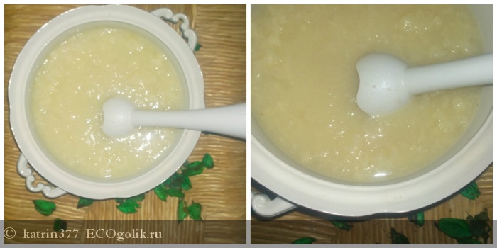 3. Готовую капусту стоит охладить, хотя, если в вашем блендере можно перемалывать горячие продукты, то можно и так. У меня погружной блендер. Перемалываю до однородной консистенции, можно добавить воды, чтобы текстура была, как у густой сметаны. Проверяем, чтобы не оставалось комочков.