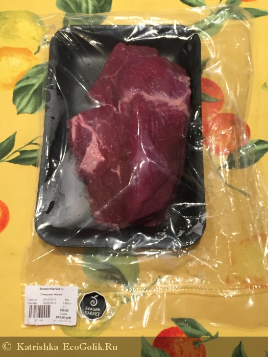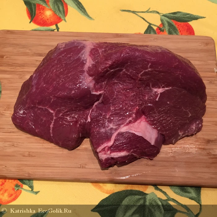 Говядины мне привезли, что в прошлый, что в этот раз очень свежий, не заветренный, красивого цвета и правильного запаха кусок. Но в прошлый раз мясо, когда я его приготовила на сковородке, было жилистым и его довольно сложно было прожевать. Местами оно было, как «мясная жевачка». Хотя кусок мяса выглядел очень красиво.