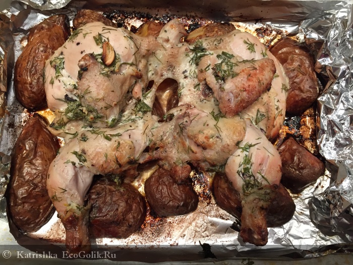Для цыпленка сделали соус. Сметана + сушеный базилик (с огорода на даче) + тертый перец + морская соль + свежий укроп + давленный чеснок. (Кстати, в Икее мы купили классную чеснокодавилку. В ней не застревает чесночный жмых и ее легко промыть. Рекомендую) Обмазали цыпленка этим соусом и выложили на противень на картофель. Время готовки, к сожалению, сейчас точное не могу вспомнить. Но дождались, когда эта вся красота будет выглядеть вот так: