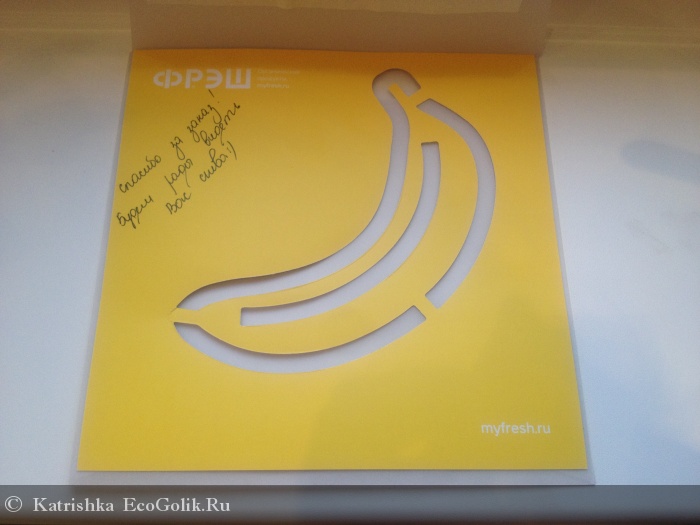 Помимо всех этих вкусняшек, в заказе были очень приятные сюрпризики: 1. Открытка позитивно желтого цвета с трафаретом банана и надписью от руки, красивым почерком: Спасибо за заказ! Будем рады видеть Вас снова