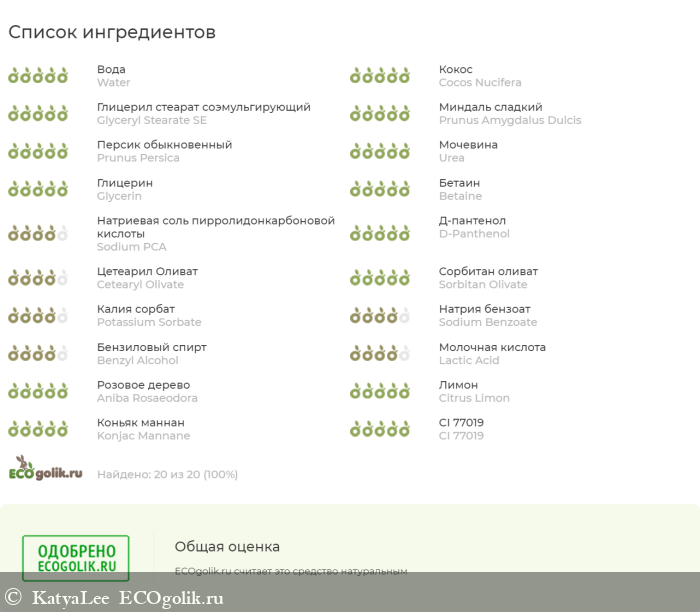 Вода, кокосовое масло, глицерил стеарат SE, миндальное масло, масло персиковое, мочевина, глицерин, бетаин, натриевая соль пирролидонкарбоновой кислоты, декспантенол, цетеарил оливат, сорбитан оливат, сорбат калия, бензоат натрия, бензиловый спирт, молочная кислота, эфирное масло розового дерева, эфирное масло лимона, коньяк маннан, CI 77019.