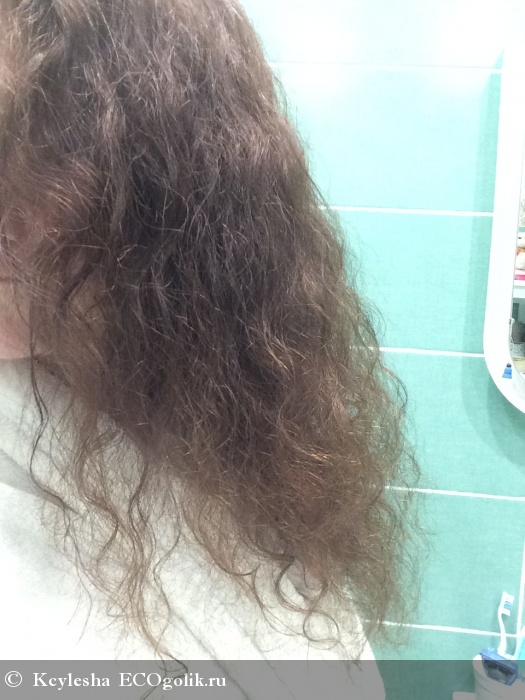 На фото выше то, что делает шампунь с моими волосами после мыть головы (с использованием маски на всю длину причем не 2 часа, а в течение дня, если нанести на 2 часа маску, а затем смыть, эффект будет устрашающим). Видно, что кончики подсушены, волосы скорее волнистые, чем кудрявые и выглядят как мочалка. Особого блеска они не излучают.