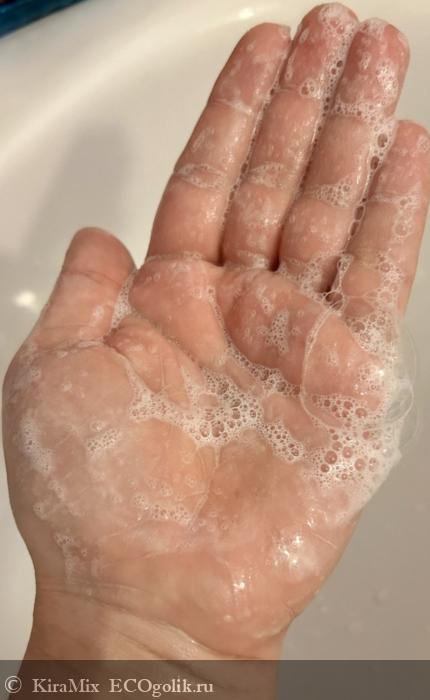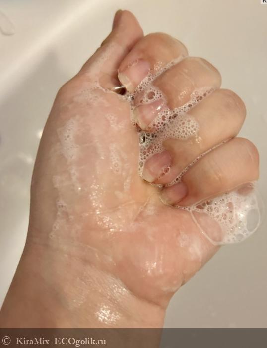 Начну, как и всегда, с применения. Мне нравится, что средство удобно лежит в руке, не выскальзывает, не убегает. Все комфортно и без приключений.