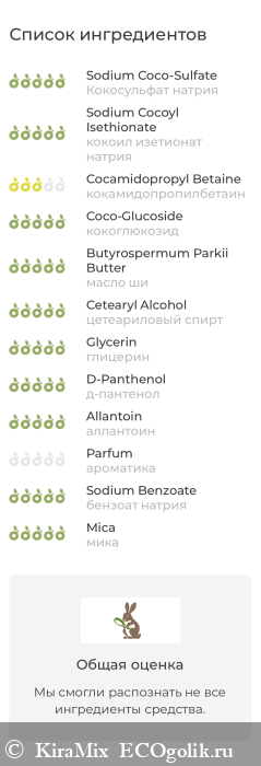 Кокосульфат натрия, кокоил изетионат натрия, кокамидопропилбетаин,кокоглюкозид, масло ши, цетеариловый спирт, гидрованс, глицерин,протеины риса, д-пантенол, аллантоин, ароматика, бензоат натрия, мика
