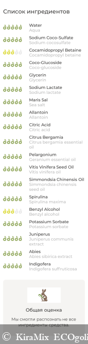 Aqua (вода дистиллированная), Sodium cocosulfate* (кокосульфат натрия), Cocamidopropyl betaine (кокамидопропилбетаин), Coco-glucoside (кокоглюкозид), Glycerin (глицерин), Sodium lactate (лактат натрия), Sea salt (соль морская), Allantoin (аллантоин), Juniperus communis essential oil (эфирное масло можжевельника), Citric acid (лимонная кислота), Citrus bergamia essential oil (эфирное масло бергамота), Geranium essential oil (эфирное масло герани), Vitis vinifera oil (масло виноградной косточки), Simmondsia chinensis (jojoba) seed oil (масло жожоба), Tocopheryl аcetate (витамин Е), Spirulina maxima (спирулина), Benzyl alcohol (бензиловый спирт), Potassium sorbate (сорбат калия), Juniperus communis extract (экстракт можжевельника), Abies sibirica extract (экстракт пихты), Pinus silvestris extract (экстракт сосны), Indigofera suffruticosa (корень индиго молотый). *является мягким ПАВ, получаемым из кокосового масла