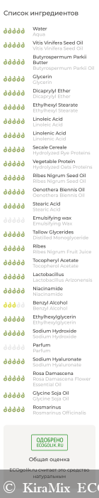 Aqua, Vitis Vinifera Seed Oil, Butyrospermum Parkii (Shea Butter) Oil, Glycerin, Dicaprylyl Ether, Ethylhexyl Stearate, Linoleic Acid and Linolenic Acid (Ethyl Ethers Of Unsaturated Faty Acids), Hydrolyzed Wheat Proteins, Hydrolyzed Rye Proteins, Hydrolyzed Oats Proteins, Ribes Nigrum Seed Oil, Oenothera Biennis Oil, Stearic Acid, Emulsifying Wax, Distilled Monoglyceride, Ribes Nigrum Fruit Juice, Tocopherol Acetate, Lactobacillus Arizonensis, Niacinamide, Benzyl Alcohol, Ethylhexylglycerin, Sodium Hydroxide, Parfum, Sodium Hyaluronate, Rosa Damascena Flower Essential Oil, Glycine Soja (Soybean) Oil, Rosmarinus Officinalis.