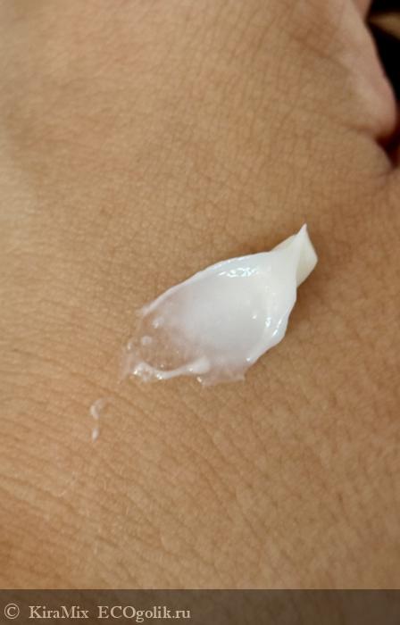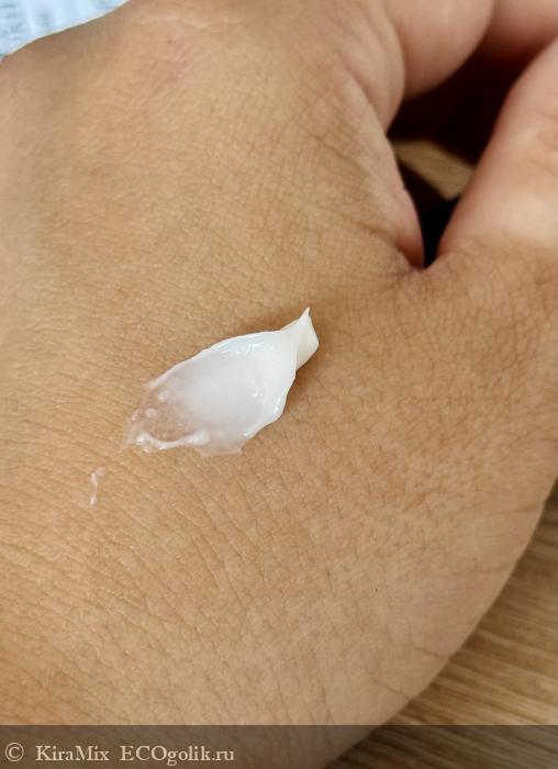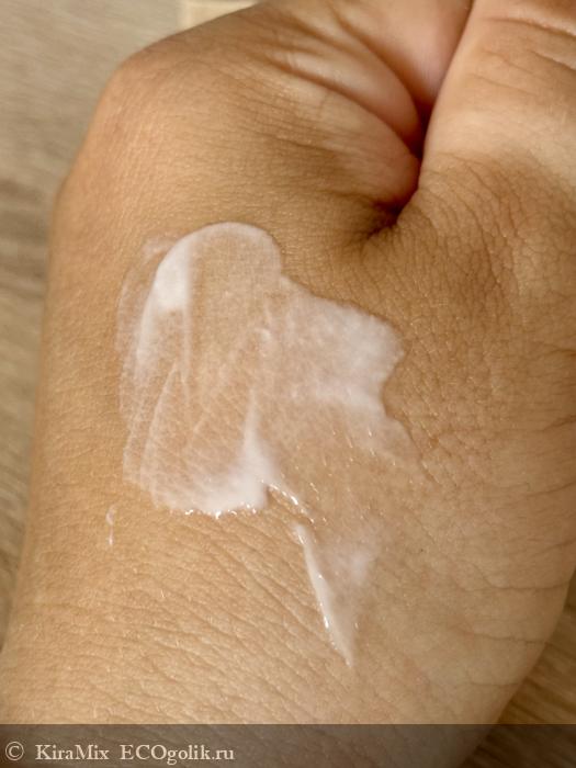 💜Текстура. По началу кажется очень густой, но при контакте с кожей меняется становится более податливой. Консистенция приятная, однородная и ,что супер важно, не липкая.