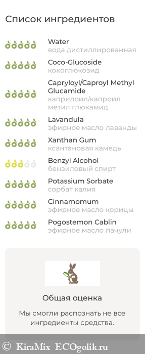 вода дистиллированная (Aqua), кокоглюкозид (Coco-glucoside), каприлоил/капроил метил глюкамид* (Capryloyl/caproyl methyl glucamide), масло миндаля (Prunus amygdalus dulcis (sweet almond) oil), эфирное масло лаванды (Lavender essential oil), ксантановая камедь (Xantan gum), бензиловый спирт (Benzyl alcohol), сорбат калия (Potassium sorbate), эфирное масло корицы (Cinnamon leaf essential oil), эфирное масло пачули (Patchouli essential oil), корень индиго молотый (Indigofera suffruticosa).