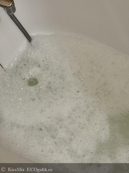 Начну с применения. Чтобы сделать себе полную ванну нужно совсем немного пены. Во-первых, густая текстура. Во-вторых, она пенится прям от души.