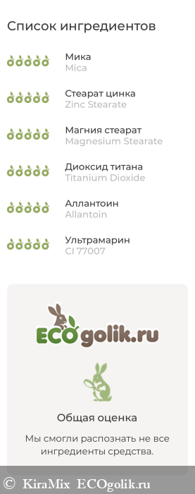 слюда, обработанная лауроил лизином (Mica CI 77019 treated with Lauroyl Lysine), стеарат цинка (Zinc Stearate), стеарат магния (Magnesium Stearate), диоксид титана (Titanium Dioxide Cl 77891), аллантоин (Allantoin), +- оксиды железа (Iron Oxide CI 77491, CI 77492, CI 77499), ультрамарины (Ultramarine Blue CI 77007)