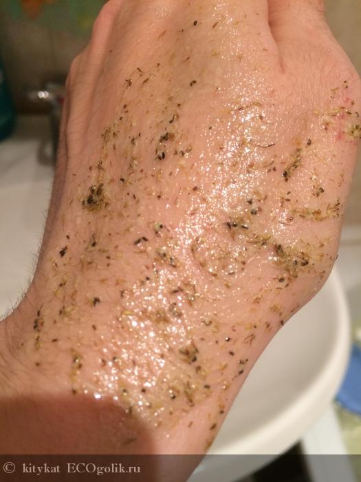 Частички трав и семян неплохо отшелушивают кожу, действуют как мягкий пилинг. После умывания кожа приобретает здоровый румянец и заметно разглаживается. Мыло глубоко очищает поры и избавляет от черных точек.