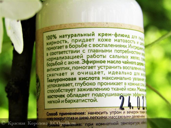 100% натуральный крем-флюид для жирной и комбинированной кожи лица уменьшает жирность, придает коже матовость и шелковистость, помогает в борьбе с воспалениями. Ингредиенты подобраны в соответствии с главными потребностями жирной кожи - нормализацией работы сальных желез, сужением пор, борьбой с акне. Эфирное масло чайного дерева природный антисептик, помогает устранить воспаления и зуд. Масло ши смягчает и очищает, идеально для жирной кожи. Гиалуроновая кислота максимально увлажняет, освежает и успокаивает, глубоко проникает в кожные слои. Д-пантенол способствует заживлению тканей кожи. Масло виноградных косточек обладает подсушивающим эффектом, делает кожу мягкой и бархатистой.