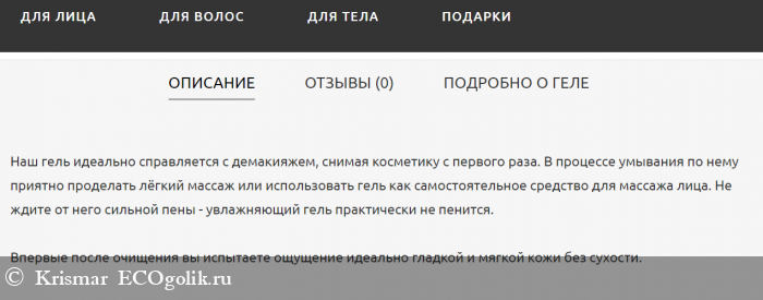 «Наш гель идеально справляется с демакияжем, снимая косметику с первого раза. В процессе умывания по нему приятно проделать лёгкий массаж или использовать гель как самостоятельное средство для массажа лица. Не ждите от него сильной пены - увлажняющий гель практически не пенится.
