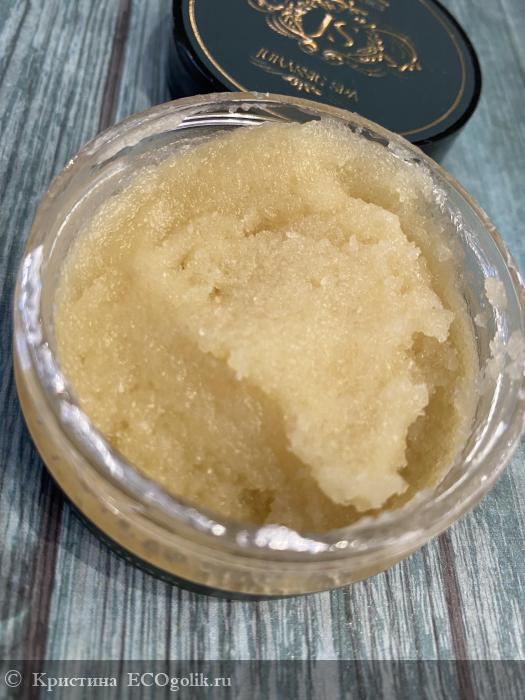 Скраб в баночке как шайба, на упаковке наклейка как-будто матова я и сред красивого цвета с золотыми буквами.