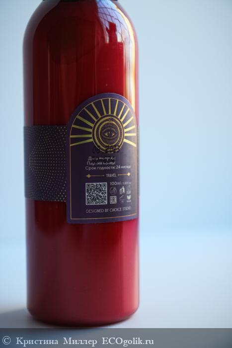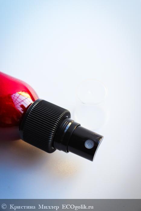 Сам флакон в котором находится состав выполнен из затемненного пластика, упругого, плотного, в бордовом цвете. Крышка-колпачек сама прозрачная. Распылитель мелкодисперсный, комфортные капельки, маленькие.