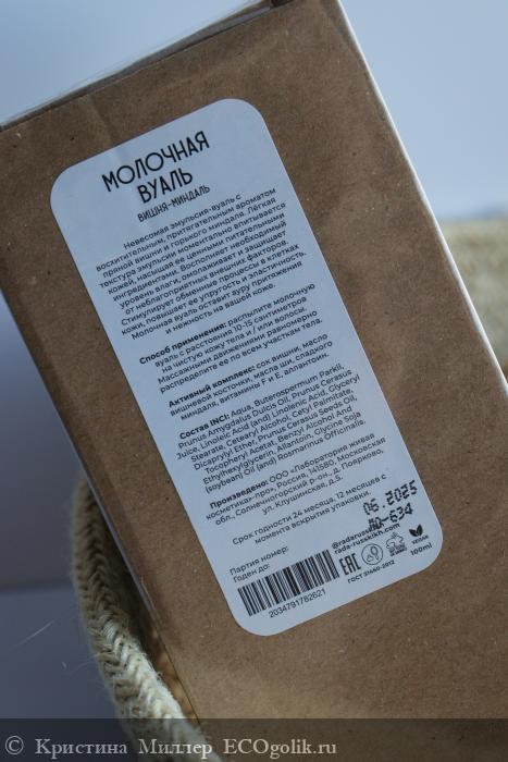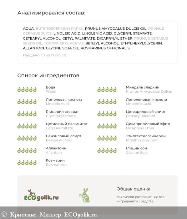 - Активный комплекс: сок вишни, масло вишневой косточки, масла ши, сладкого миндаля, витамины F и Е, аллантоин