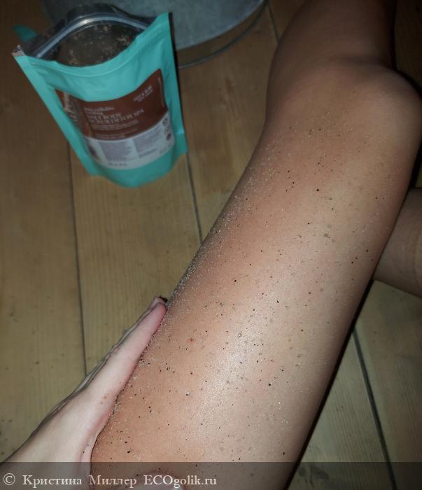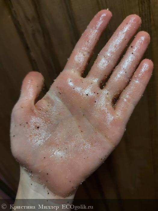 Для начала я взяла малое количество скраба и натерла его в парилке НА СУХУЮ кожу, конечно я не ждала, что скраб будет иметь хорошее сцепление с сухой кожей, текстура не позволяет, но я не поняла, почему в процессе рука не скользит как обычно бывает, а прилипает и будто тормозит....и я пошла в душевую