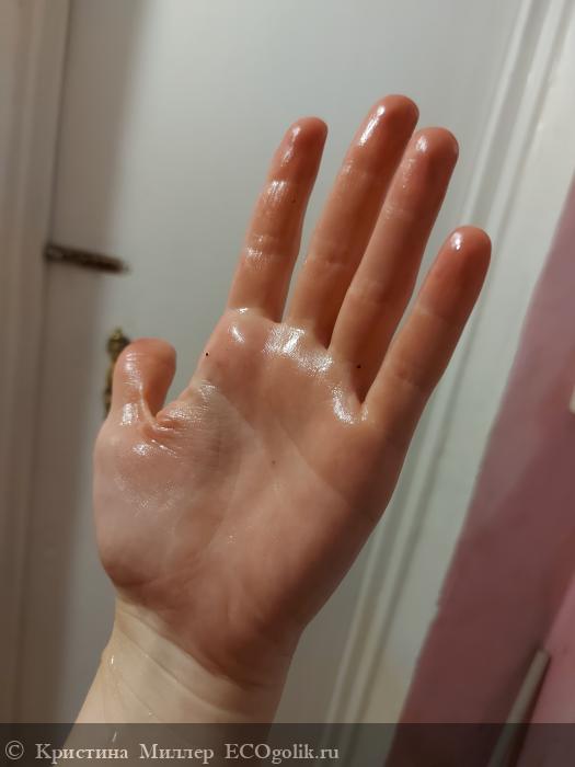 Обратите внимание на руку. Первый кадр это после того как я скрабировала свои ноги... второй это когда я попыталась смыть скраб горячей водой. Моя рука будто в липкой резиновой перчатке, в оболочке, она неприятно пахнет горьким маслом, она липкая и такая странная...