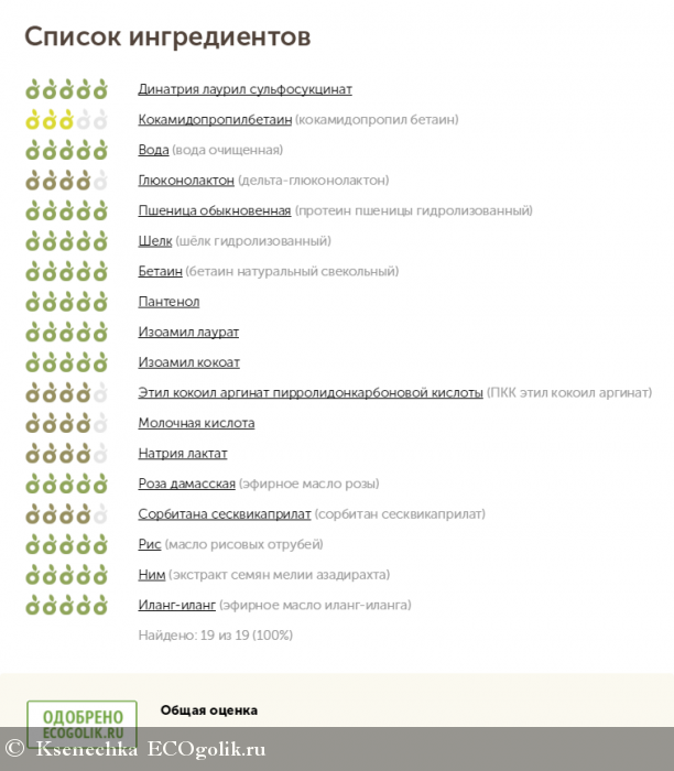 Состав: натрия кокоил изотионат, динатрия лаурил сульфосукцинат*, кокамидопропил бетаин*, вода очищенная, дельта-глюконолактон, протеин пшеницы гидролизованный, шёлк гидролизованный, бетаин (натуральный свекольный)*, эфиры фитостеролов масла семян горчицы абиссинской*, пантенол, изоамил лаурат*, изоамил кокоат*, ПКК этил кокоил аргинат*, молочная кислота, натрия лактат, эфирное масло розы, сорбитан сесквикаприлат*, масло рисовых отрубей, экстракт цветов мелии азадирахта (дерева ним), экстракт семян мелии азадирахта (дерева ним), экстракт фруктов кокцинии индийской, эфирное масло иланг-иланга.