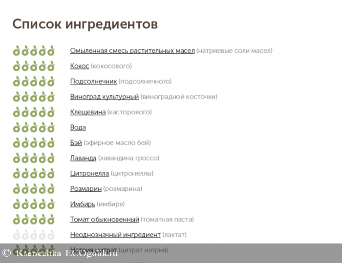 Состав: натриевые соли масел (кокосового, подсолнечного, виноградной косточки, касторового), вода, эфирное масло бей, лавандина гроссо, цитронеллы, розмарина, имбиря, томатная паста, лактат и цитрат натрия.