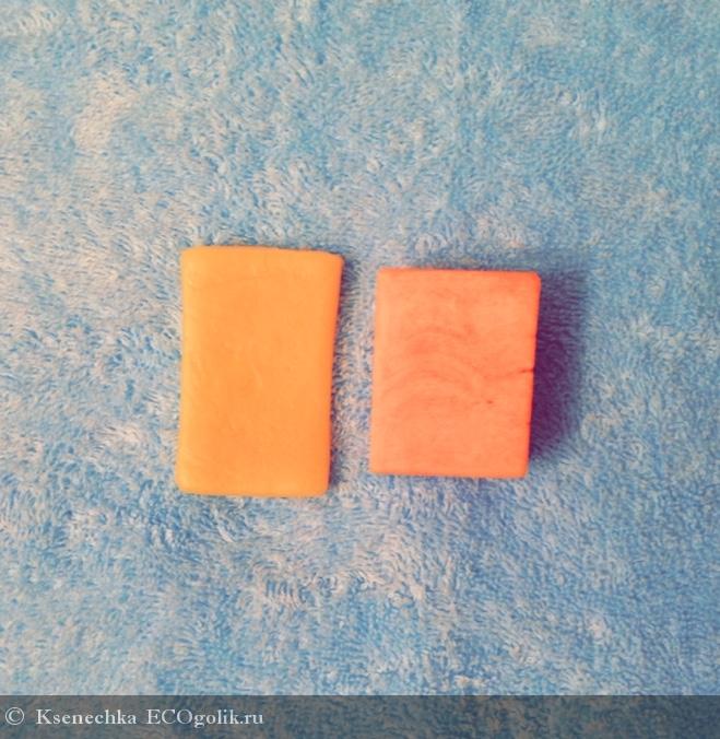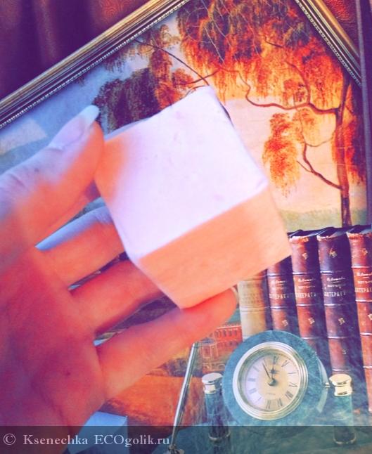 На вид брусочек милого розового цвета, тактильно как-будто жирноват и шероховат
