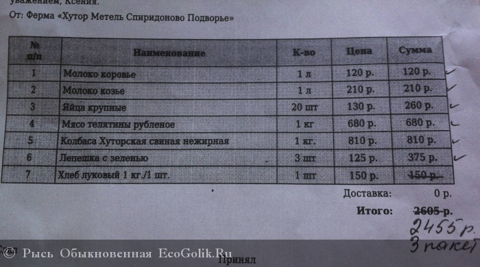 Плюсы: курьер вежливый, продукты супер – все вкусные, деревенские.