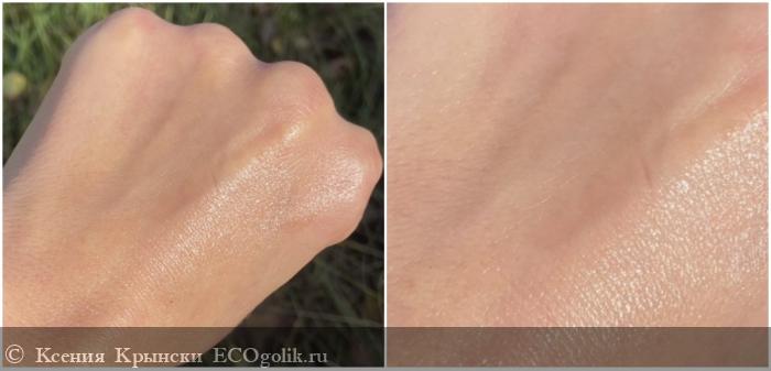 Впитывается на моей коже быстро без липкости или жирности, остаётся лёгкий сияющий финиш.