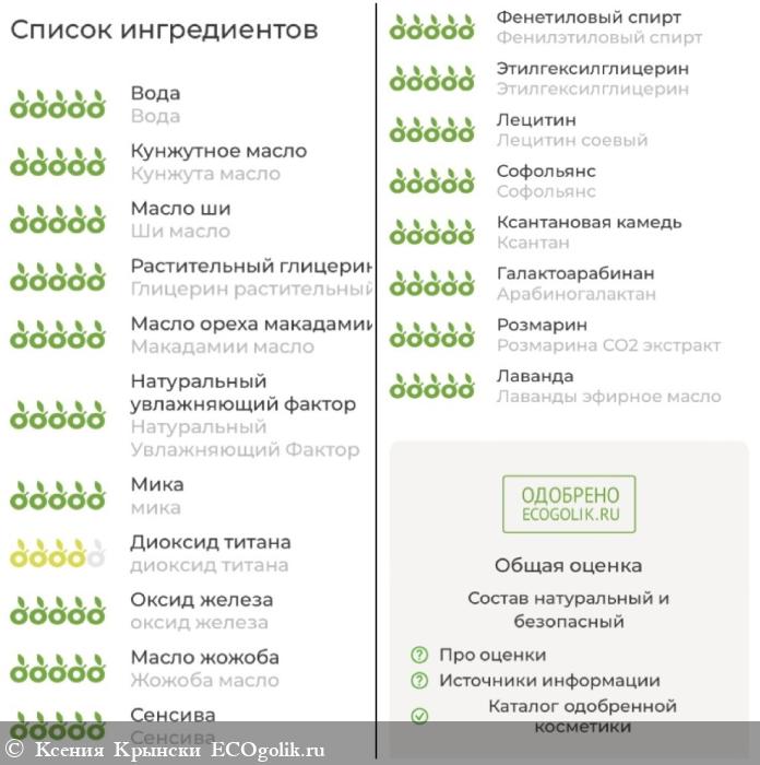 Вода, Кунжута масло, Ши масло, Имвитор (Глицерил цитрат/лактат/линолеат/олеат), Глицерин растительный, Макадамии масло, Натуральный Увлажняющий Фактор (Бетаин, Натрия РСА, Натрия лактат, Пирролидон карбоксилат, Серин, Аланин, Глицин, Глютаминовая кислота, Лизин (гидрохлорид), Треонин, Аргинин, Пролин), Минеральный пигмент (мика, диоксид титана, оксид железа), Жожоба масло, Сенсива (Фенилэтиловый спирт, Этилгексилглицерин), Лецитин соевый (без ГМО), Софольянс (Пробиотик: Фермент гриба Бомбикола/Глюкоза/Метил фермента рапса), Ксантан, Арабиногалактан (пребиотик), Розмарина СО2 экстракт, Лаванды эфирное масло.