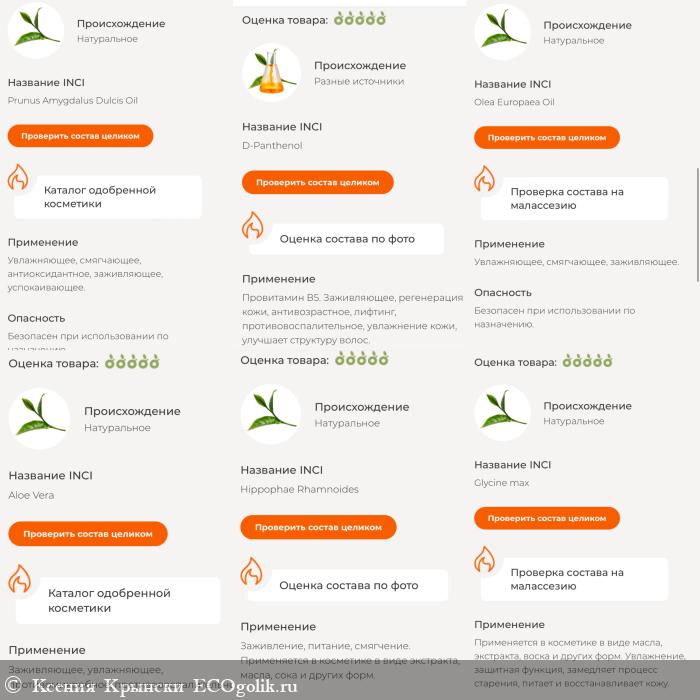 Все компоненты получили оценку пять, что подтверждает 100% натуральность средства, которое понравится самой капризной коже, как у меня. Здесь много растительных компонентов, обладающих увлажняющим, питательным, восстанавливающим и заживляющим действием.