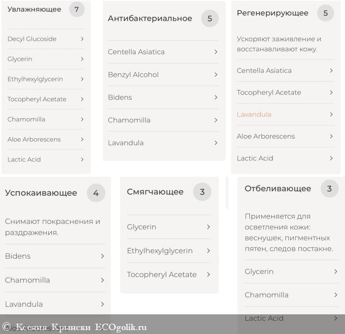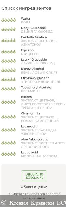 ВОДА, ДЕЦИЛ ГЛЮКОЗИД, ЭКСТРАКТ ЦЕНТЕЛЛЫ АЗИАТСКОЙ, ГЛИЦЕРИН, ЛАУРИЛ ГЛЮКОЗИД, БЕНЗИЛОВЫЙ СПИРТ, ЭТИЛГЕКСИЛГЛИЦЕРИН, ВИТАМИН Е, ЭКСТРАКТ ЦВЕТКОВ/ЛИСТЬЕВ/СТЕБЛЯ ЧЕРЕДЫ ТРЕХРАЗДЕЛЬНОЙ, ЭКСТРАКТ ЦВЕТКОВ РОМАШКИ АПТЕЧНОЙ, ЭКСТРАКТ ЛАВАНДЫ УЗКОЛИСТНОЙ, ЭКСТРАКТ ЛИСТЬЕВ АЛОЭ ДРЕВОВИДНОГО, МОЛОЧНАЯ КИСЛОТА