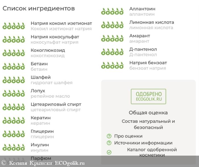 Кокоил изетионат натрия, кокосульфат натрия, кокоглюкозид, бетаин, гидролат шалфея, репейное масло, цетеариловый спирт, гидрованс, кератин, глицерин, инулин, ароматика, аллантоин, лимонная кислота, СО2 экстракт амаранта, Д-пантенол, бензоат натрия.