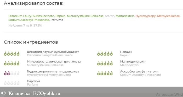 Состав продукта: Disodium Lauryl Sulfosuccinate, Papain, Microcrystalline Cellulose, Starch, Maltodextrin, Hydroxypropyl Methylcellulose, Sodium Ascorbyl Phosphate, Parfume.