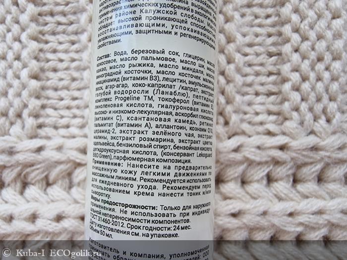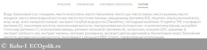 Конечно, больше всего меня привлекло в продукте - это его состав. Он шикарен. Искала я такой долго. Основа на березовом соке, далее много полезных для кожи растительных масел и экстрактов, которые восстанавливают кожный состав и повышают защитные функции кожи, гиалуроновая кислота глубоко увлажняет кожу, заполняет морщинки. Но самыми важными на мой взгляд являются - ниацинамид, он же витамин В3, пептидный комплекс Progeline TM, витамины А, Е и С, коэнзим Q10, церамид и экстракт голубой водоросли, он же ланаблю. Данные компоненты отлично подходят для борьбы с возрастными изменениями, призваны восстанавливать кожу, питать ее и увлажнять. Церамиды, будто строительные кирпичики кожи, встраиваются в ее структуру, заполняя образовавшиеся пустоты. Коэнзим повышает тонус кожи, подтягивает и уплотняет ее. Ланаблю - растительный аналог ретинола. Но в отличии от самого ретинола, не вызывает раздражений. Он помогает справляться с шелушениями, обновляет клетки.
