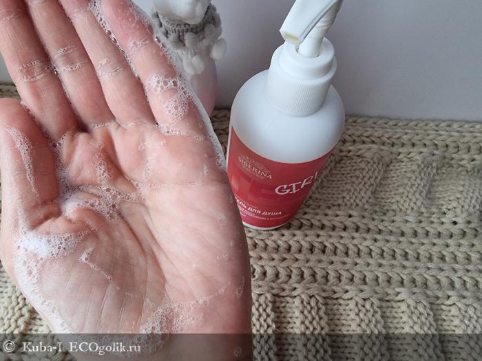 Консистенция жидкая, прозрачная, ароматная, растекается по коже. Гель хорошо пенится при контакте с водой и растирании между ладоней или с помощью мочалки. Пена окутывает и нежно очищает кожу.
