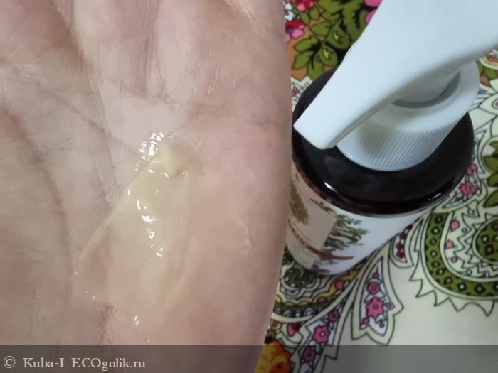 Текстура у бальзама, как у молочка, в меру густая, но легкая. Аромат травяной. Цвет бледно-желтый.