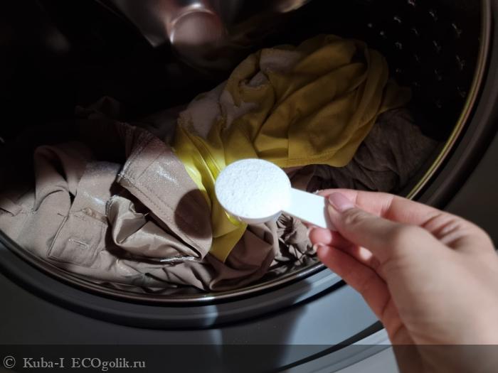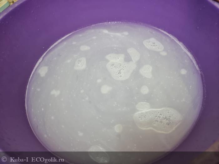 Ручная стирки с порошком Ecological не менее эффективная. Ниже на фото растворила 1 мерную ложку порошка в воде, но не смогла добиться пены. Вода мутная. Вещи замачиваю, потом стираю руками. Вроде все отстиралось. Ничего плохого тоже не скажу.