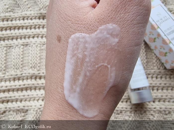 Крем распределяется однородной массой, быстро впитывается. В нем нет никаких вкраплений, на фото лежит не ровно только из-за моих волосков на коже.