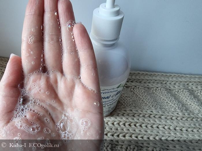 При контакте с водой мыло хорошо пенится, не обильно, но вполне достаточно, чтобы окутать кожу.