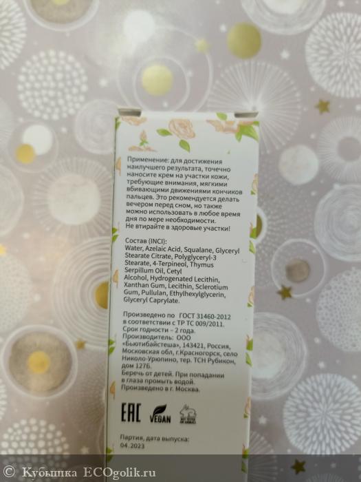 Этот крем с 10% микронизированной азелаиновой кислотой, в сочетании с 4-Terpineol из масла чайного дерева и маслом тимьяна. Кстати, запах из-за чайного масла специфический. Но главное, что крем действенный. Потерпим)).