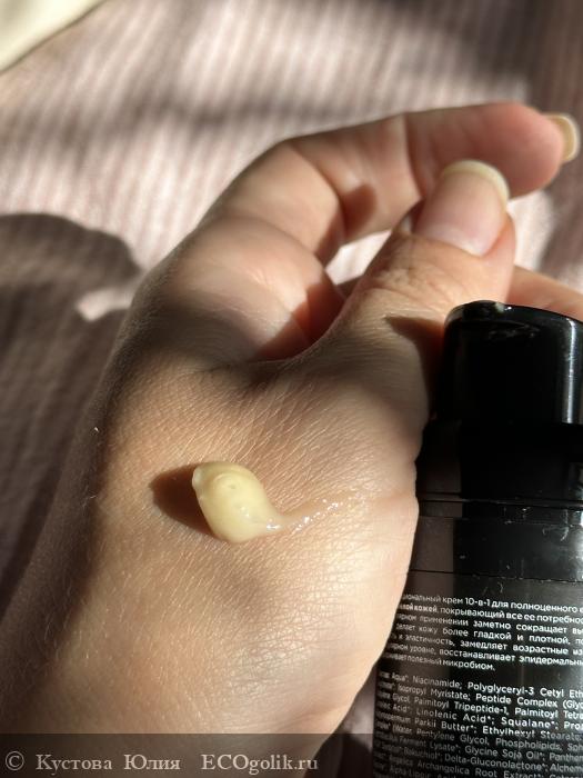 4)текстура насыщенная и легко распределяется по коже. Двух нажатий на дозатор хватает на лицо, шею и декольте с учетом лёгкого массажа. Кстати, иногда делаю по этому крему массаж скребком гуаша. Прекрасно скользит))