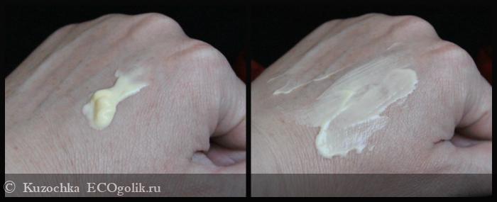 Если сравнивать текстуру крема с №9, то Антивозрастной имеет более оплывающую консистенцию, сразу после выдавливания порция выглядит, как на фото (9-й лежит плотной колбаской). Цвет светло-желтый.