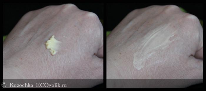 Я прокачала несколько раз помпу перед первым использованием, крем вышел причудливой лентой-змейкой; видно, как средство держит форму, не растекается. Оттенок желтоватый с зеленцой