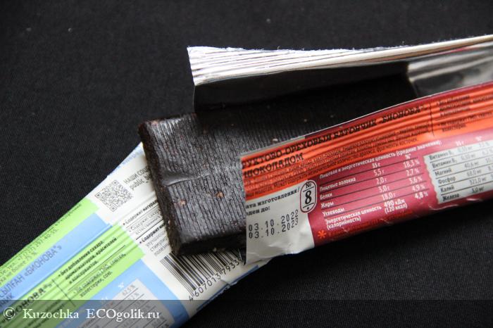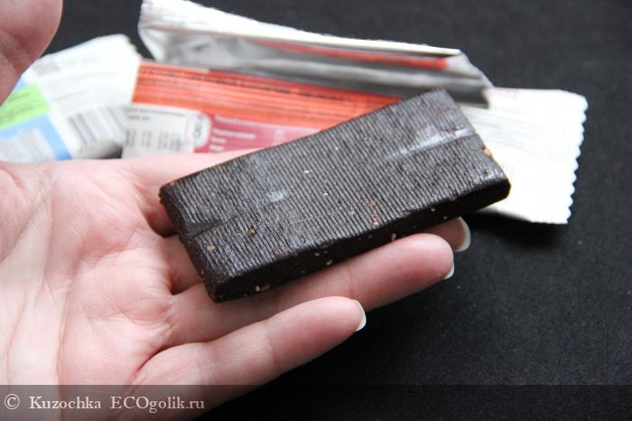 Батончик очень темный, с явным привкусом какао. Этот вариант мне не очень понравился, т.к. шоколад в сочетании с финиковой основой не сочетается, как по мне.