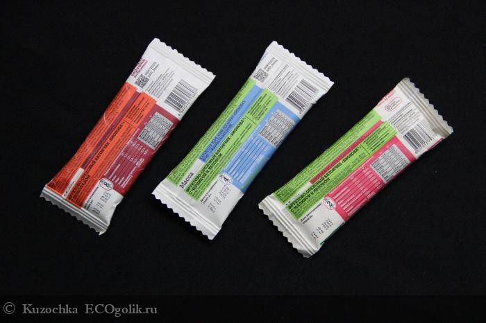 Батончики одинаковые по размеру, этикетки оформлены в едином стиле.
