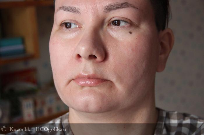 На лице нет ничего, кроме блеска. Свет дневной. Нанесение обильное.