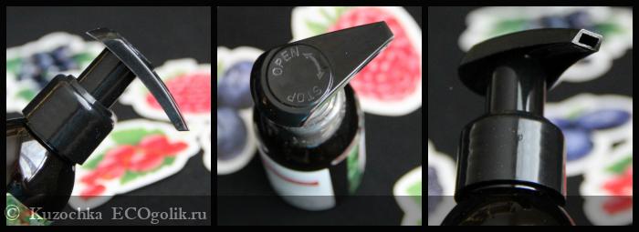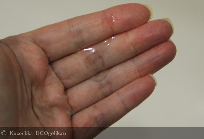 Помпой пользовать удобно, она выдает столько, сколько необходимо (неполное нажатие). Расход мизерный. Количество, используемое на одно умывание, запечатлено на фото. Гель прозрачный, имеет сладкий не приторный фруктово-ягодный аромат.